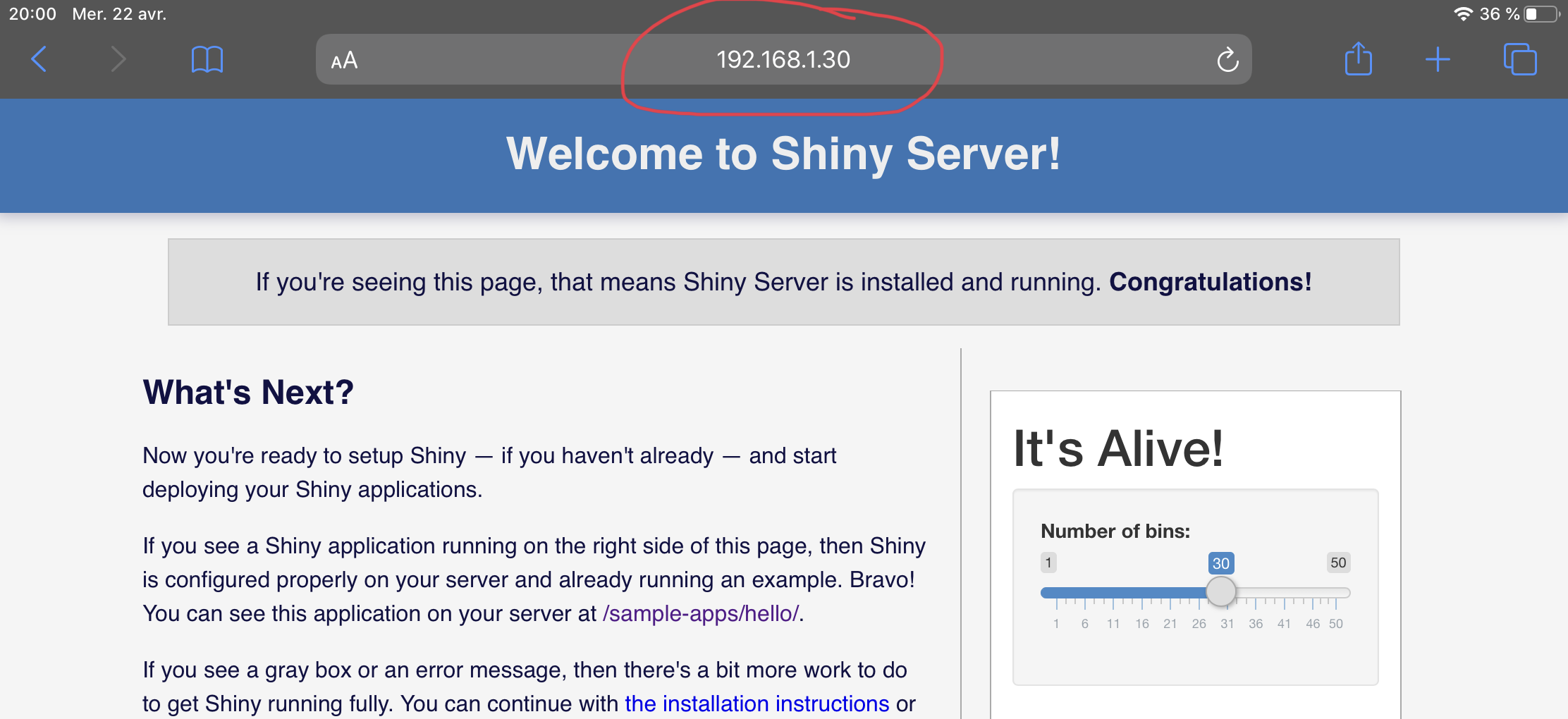 Une fois que vous avez fini de configurer le serveur shiny sur votre ordinateur tous les appareils connectés au même réseau que votre ordinateur peuvent accéder au serveur par le biais de l’adresse IP de votre ordinateur.